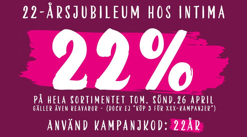 Sedan mer än 20 år tillbaka har Intima sålt sexleksaker både i butik och online, vilket gör Intima till en av de äldsta och största i branschen i Sverige. Nätförsäljningen började vi med redan 1998 och öppnade sedan Intimas första fysiska sexbutik år 2004 i Norrköping. Alla våra produkter finns för omgående leverans eller upphämtning i butik, om du så föredrar. I sortimentet finner du allt från: Vibratorer, dildos, stimulansoljor, potens-hjälpmedel, till produkter för intimvård, underkläder, sexspex med mera! Det mesta för de flesta som verkligen sätter guldkant på vardagen.