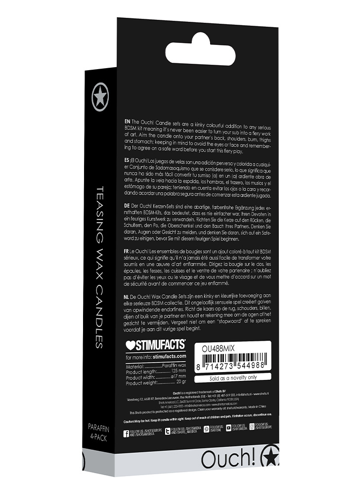 Ouch! Har tidigare kammat hem pris för bästa bondageprodukter och fortsätter leverera. Kittet innehåller 4 små vaxljus i olika färger och varje ljus mäter upp till 12,5 cm.