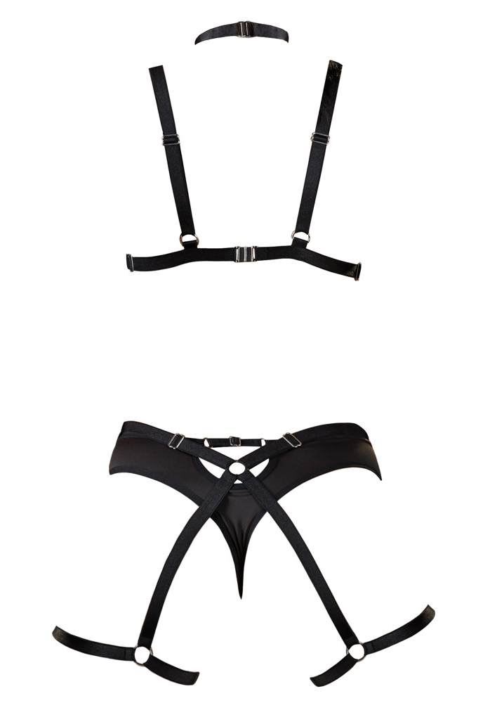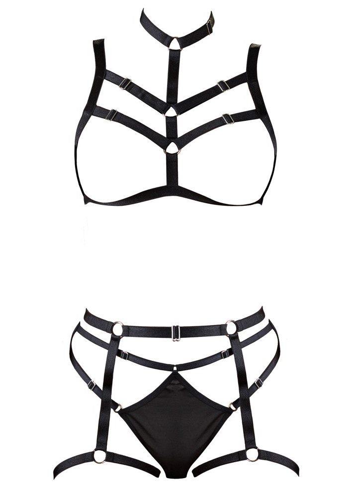 Ett 3-delat harness-set med bröstharness, midjeharness och matchande string – designat för att rama in kroppen och förstärka dina former med självsäker precision.