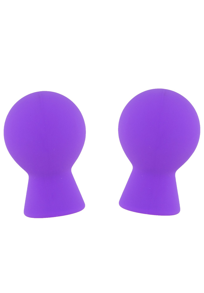 Två stycken lilafärgade sugkoppar för bröstvårtorna. Placera dem båda på bröstvårtorna och tryck på bollarna och släpp och de suger sig kvar. Bröstvårtorna blir styva och känsligare vid beröring. Dessa sugkoppar har en diameter på 3,5 cm.