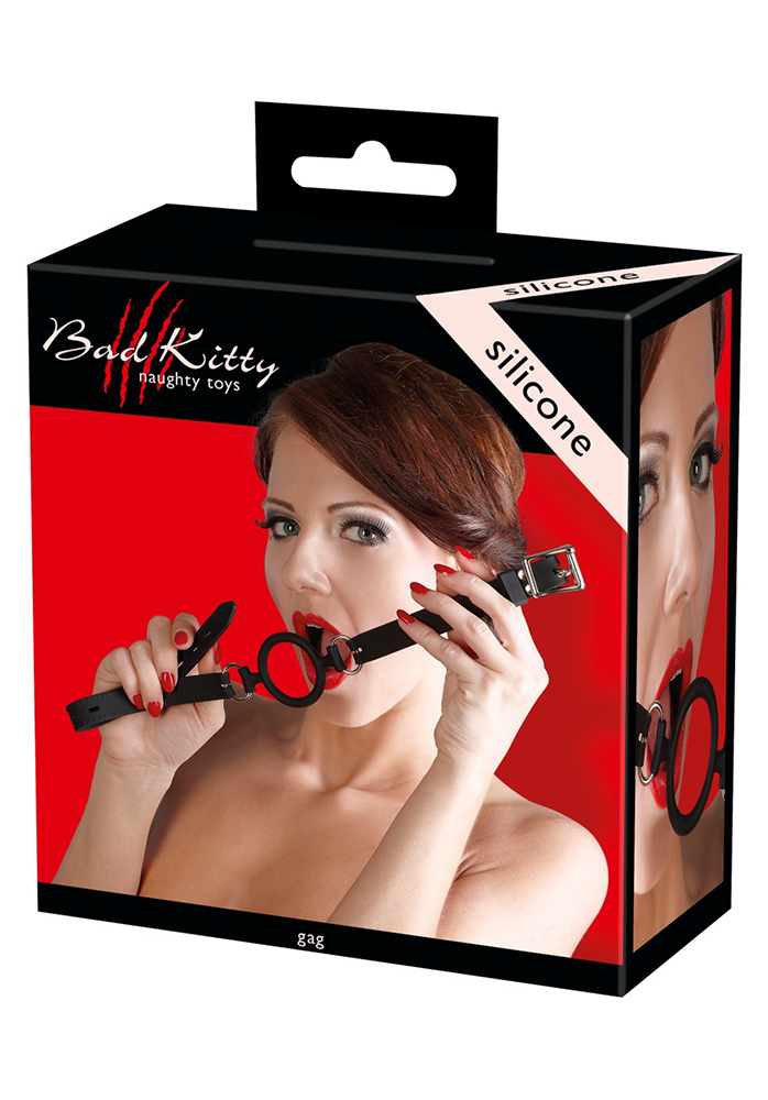 Svart O-ring gag med justerbara remmar i silikon. Ringen sätts i munnen som en spärr och håller bärarens mun öppen 5 cm. Metallringen som man sätter i munnen är klädd i silikon och är inte flexibel. Yttre diametern på ringen är 5 cm och innermåttet på ringen är 3,7 cm.