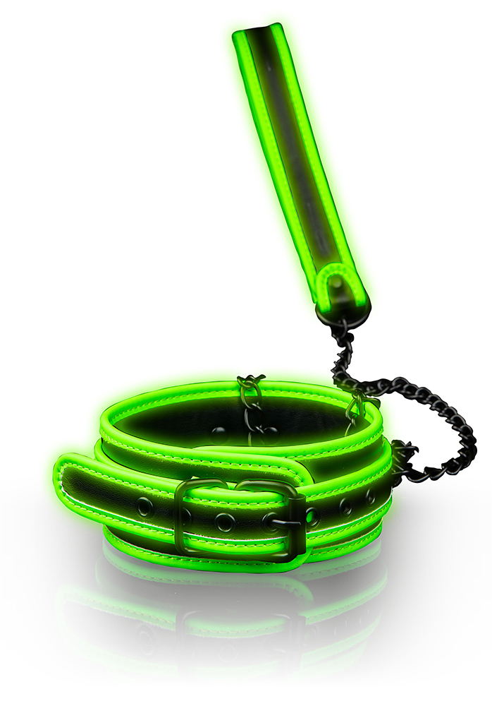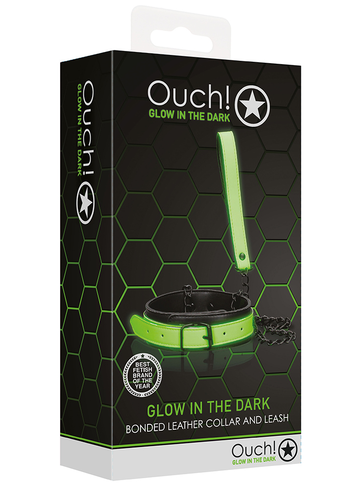 Denna justerbara krage är ursnygg i sig, men är ännu bättre med kopplet och den självlysande effekten. Kopplet erbjuder rätt mängd rörelse för både komfort och återhållsamhet. En krage med koppel är ett måste i din BDSM-utstryrsel. Ouch! Glow in the dark-produkterna måste aktiveras under en lampa eller i solljus en stund innan de kan avnjutas i mörkret.