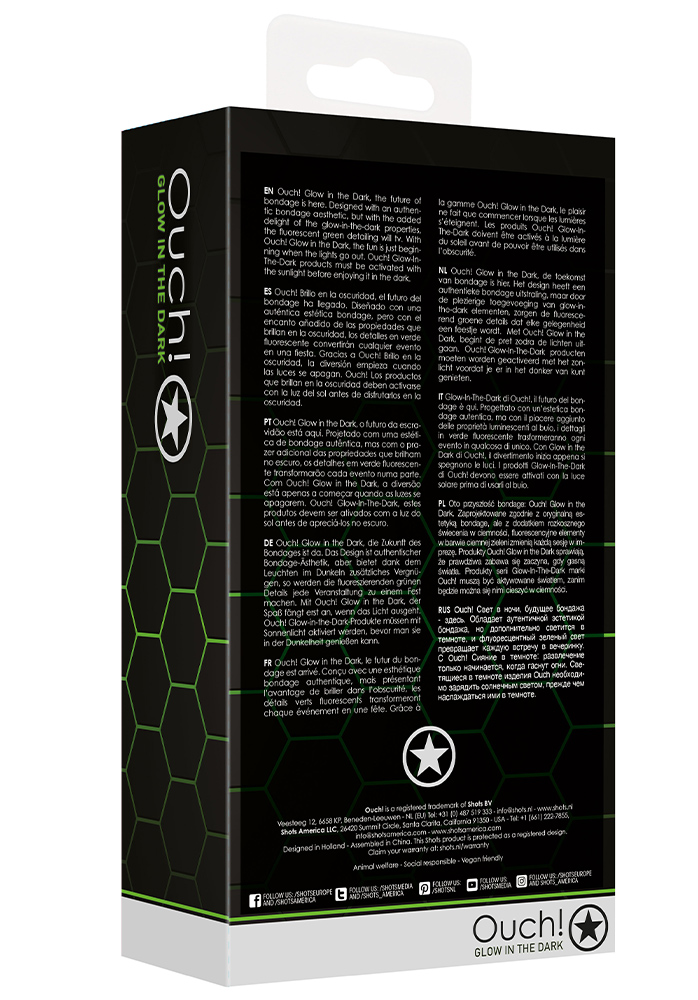 Ouch!- Glow in the Dark, bondage-serie är här! Designad med en autentisk bondage-estetik, men med en extra touch så lyser de i mörkret. Lägg dem under en lampa en stund före användning och de fluorescerande gröna detaljerna kommer att lysa upp i mörkret. Med Ouch! Glow in the Dark, har det roliga har precis börjat när ljuset släcks!