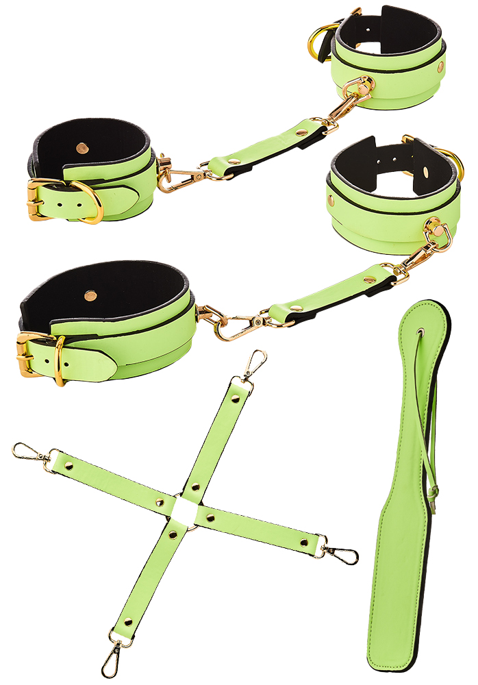 Ett komplett bondagekit för dig som vill ha allt i ett paket. Här får du handbojor, fotbojor, hog tie och paddel – perfekt matchade för att kunna användas tillsammans eller var för sig. Alla delar har glow in the dark-effekt och nickelfria metalldetaljer.
