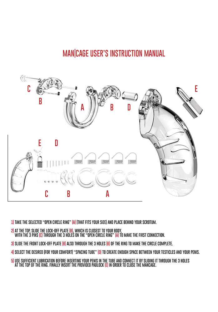 Mancage 05 passar dig med ett något större omfång men även dig som önskar uppleva en ännu mer intensiv, restriktiv upplevelse. Du kan smidigt justera burens storlek med hjälp av de ringar och pins som medföljer i kitet. Testa och upplev en helt ny form av underkastelse och kontroll!