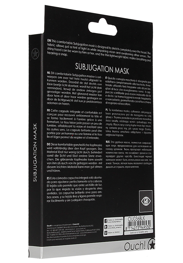 Stig in i en värld av erotisk spänning och förhöjd intimitet med Ouch!:s Subjugation-mask. Denna otroligt bekväma mask är skapad i högkvalitativ polyester och med en design som omsluter hela huvudet. Det tunna och smidiga tyget är noga utvalt för att erbjuda en unik upplevelse. Det släpper endast igenom en antydan av ljus, vilket fördunklar synen och därigenom väcker dina andra sinnen till liv. Din beröringskänslighet blir intensifierad och du kommer uppleva en fördjupad känsla av spänning och lust. Den är även mångsidig nog att kunna bäras av alla, oavsett könstillhörighet. Med Subjugation-masken kan ni båda förlora er i den erotiska spänningens värld och njuta av en upplevelse som kommer att göra er båda beroende