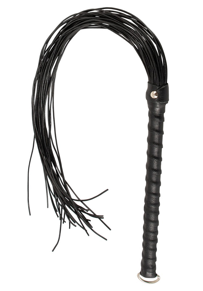 Floggern är lång och mäter upp till en totallängd på 73cm och är utformad i läder från topp till tå.