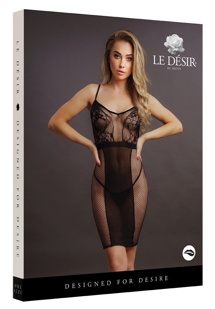 Här har vi en riktigt glamorös och avslöjande klänning. Klänningen är designad med klassiska spagettiband och jobbar med mer eller mindre täckande textilier. Toppen har mönster i spets och en mörkare svart löper centrerat ner till klänningens slut. Höftpartierna går i genomskinlig mesh för att förhöja dina kurvor.