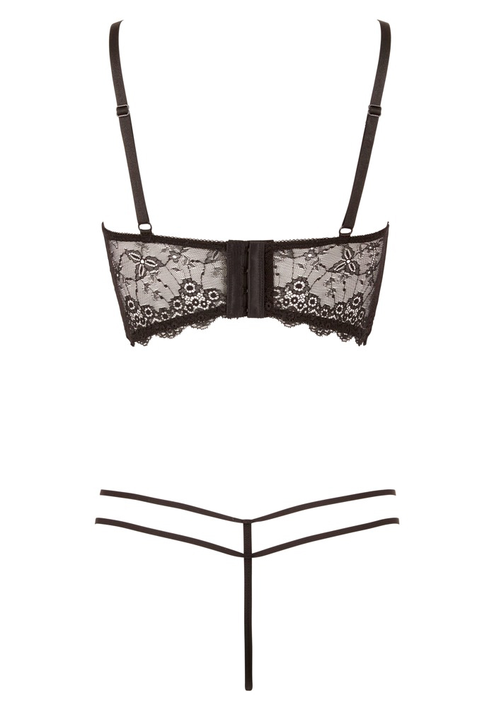 Tunn broderad spets pryder bustiern runt om, dess bygel och markerade linjer med dubbla band ovanför kupan ger en mer vågad approach och iögonfallande form till din byst. Läckra string med dubbla band för att kunna dra upp över höftbenen medföljer i kitet.