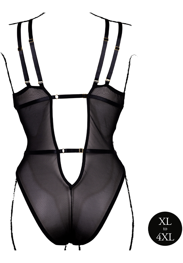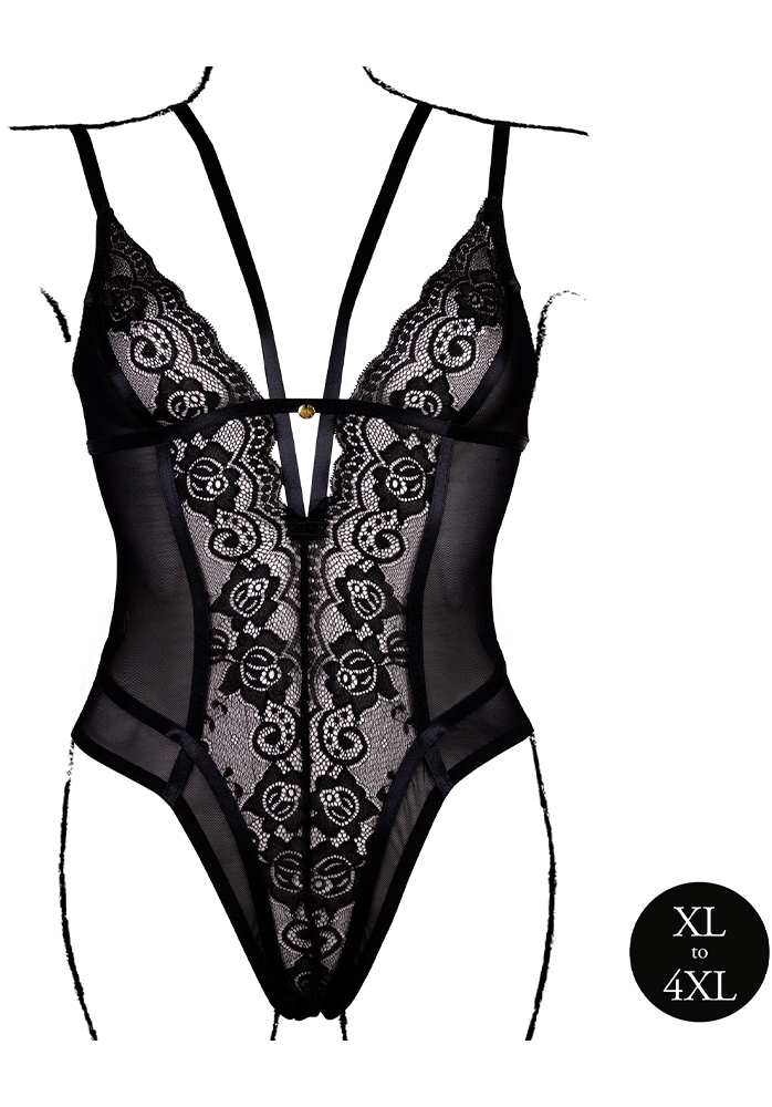 Ta på dig denna svarta och sexiga bodysuit och njut av känslan av att vara helt oemotståndlig för din omgivning. Den är helt bygel-lös för en sömlöst stilren look och samtidigt bekväm känsla, det ska vara behagligt att vara så här glamorös! Den lågt skurna urringningen är kantad med en romantisk och vacker spets som följer din kropps kurvor hela vägen ner. Bodyns skira tyg är även försett med diskreta band som omfamnar din kropp och ramar in din byst på ett lagom djärvt vis! Dessa band möts bak i den lågt skurna ryggen där smakfulla spännen låter dig justera storleken och passformen helt utefter din kropps form. Använd den på din bara kropp för ett erotisk äventyr hemmavid eller kombinera med ett par snygga byxor och kavaj för en vild kväll ute!