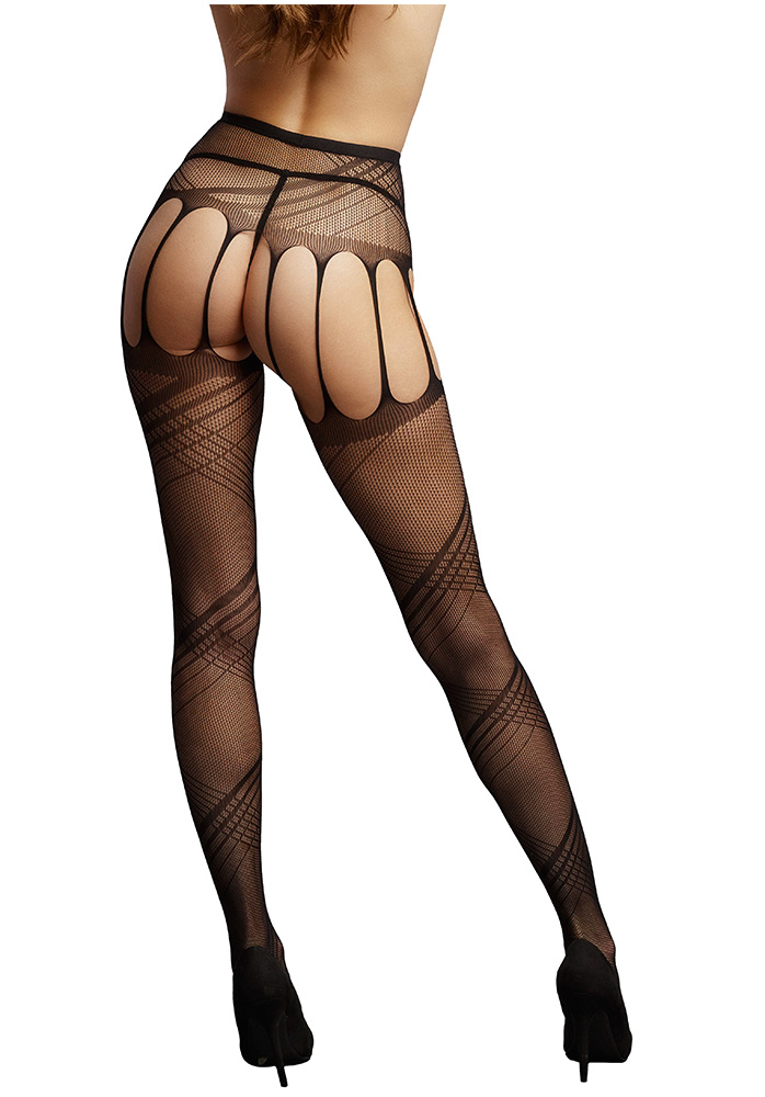 Strumpbyxor i suspendermodell med osymetriska mönster över en mörkare mesh. Strumpbyxorna har till skillnad från många andra suspenderstrumpbyxor flera band som håller ihop överdel med strumporna, vilket ger en riktigt snygg look. Kroppstrumpan är designad i ett mjukt material med mycket stretch och passar de flesta kroppar.