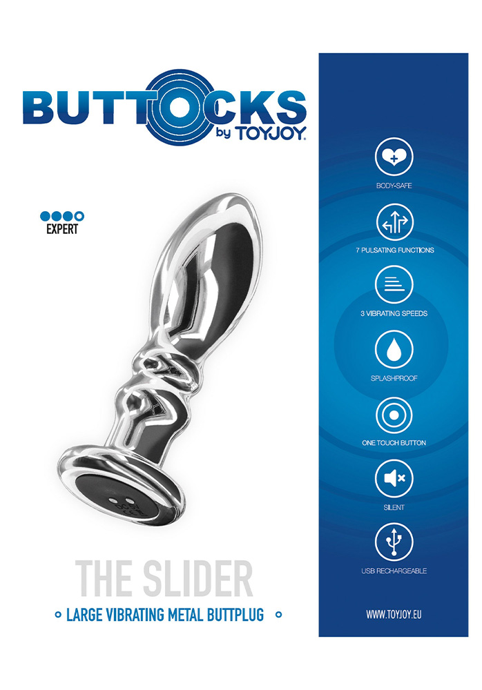 Upptäck Toy Joys Buttocks The Slider Large - en ultimat vibrerande metallisk analplugg designad för erfarna entusiaster! Tillverkad av slät rostfritt stål, ger denna plugg en stadig och stabil känsla, samtidigt som den tillåter temperaturlekar för extra sensationsrik njutning. Formad likt en standard plugg med ett par extra räfflor för extra stimulans.