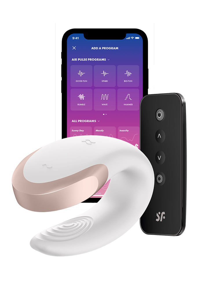 Till skillnad från denna parvibrator och Double Joy som är föregångaren är att det även medföljer en fjärrkontroll tillsammans med Double Love. Du kan alltså styra vibrationerna på tre olika sätt; antingen via knapparna på leksaken, via den trådlösa kontrollen eller på din mobiltelefon via appen Satisfyer Connect. Hur fiffigt är inte det?